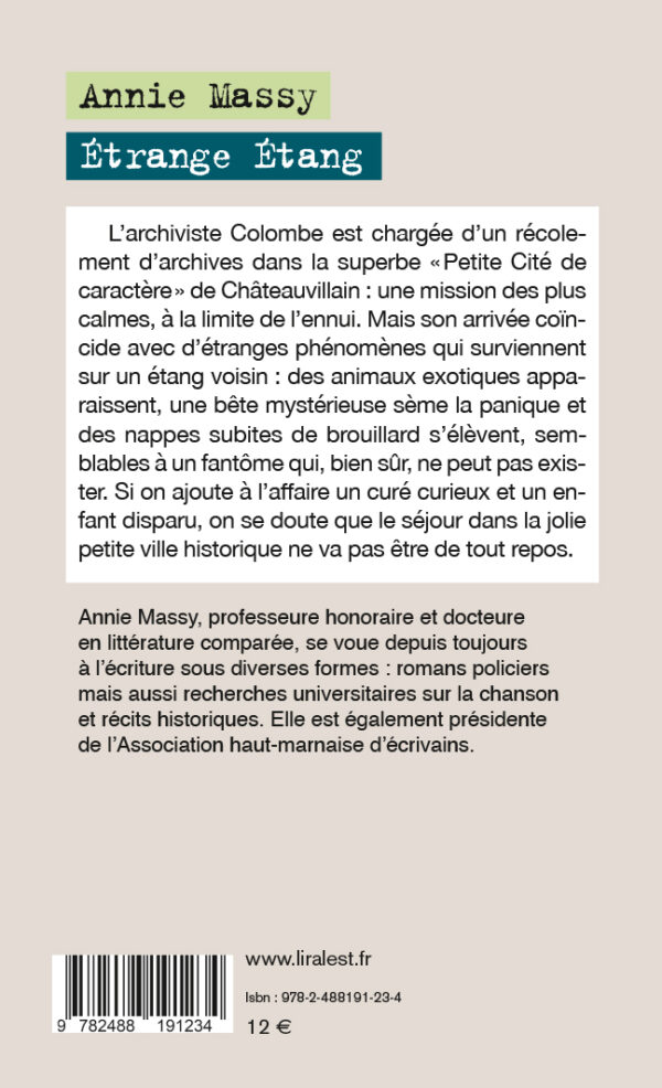 L'archiviste Colombe est chargée d'un récolement d'archives dans la superbe "Petite Cité de caractère" de Châteauvillain : une mission des plus calmes, à la limite de l'ennui. Mais son arrivée coïncide avec d'étranges phénomènes qui surviennent sur un étang voisin : des animaux exotiques apparaissent, une bête mystérieuse sème la panique et des nappes subites de brouillard s'élèvent, semblables à un fantôme qui, bien sûr, ne peut pas exister. Si on ajoute à l'affaire un curé curieux et un enfant disparu, on se doute que le séjour dans la jolie petite ville historique ne va pas être de tout repos.