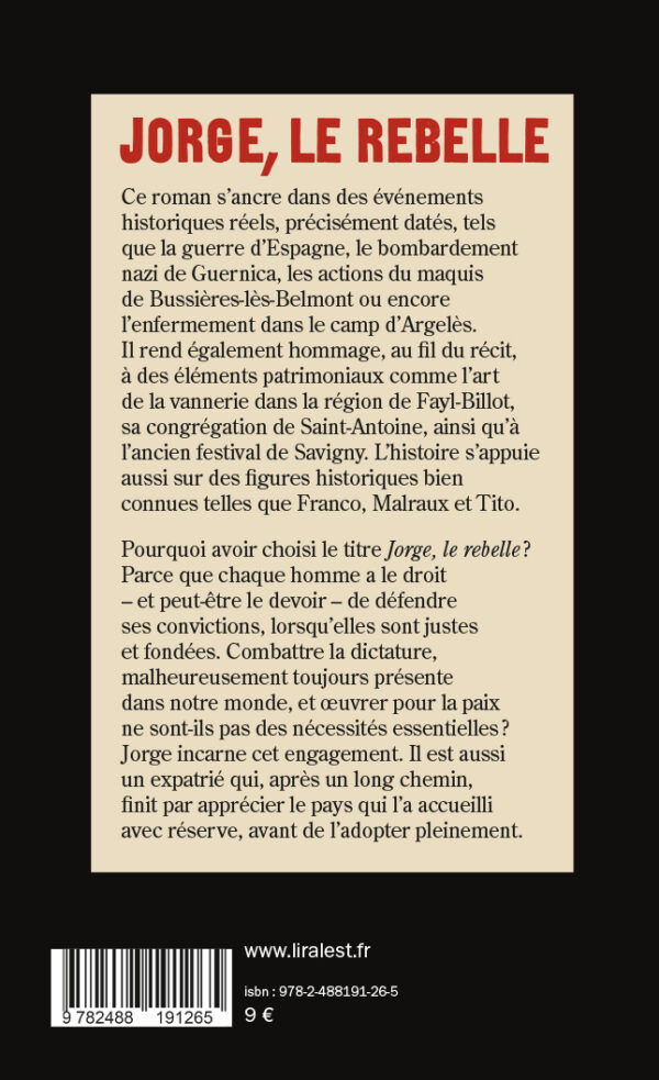 Pourquoi avoir choisi le titre Jorge, le rebelle ? Parce que chaque homme a le droit - et peut-être le devoir - de défendre ses convictions, lorsqu'elles sont justes et fondées. Combattre la dictature, malheureusement toujours présente dans notre monde, et oeuvrer pour la paix ne sont-ils pas des nécessités essentielles ?
