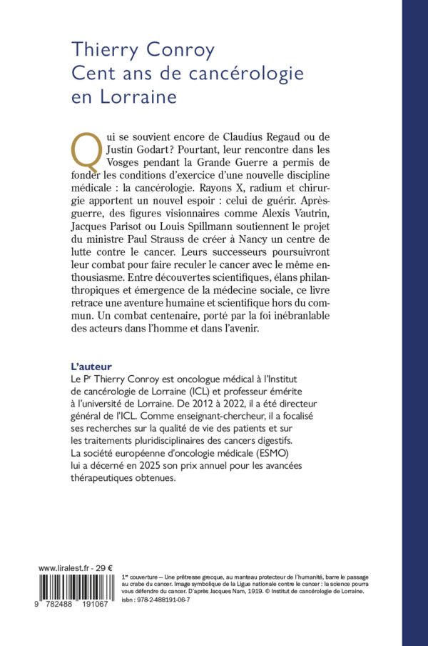 Qui aujourd’hui connaît encore les noms de Claudius Regaud, de son élève Jean Roy, ou de Justin Godart et comment ces héros de la Grande Guerre ont permis l’essor de la cancérologie en Lorraine et en France? Sans la présence du Pr Claudius Regaud mobilisé en 1914 à Gérardmer, puis à Bouleuse en Champagne, la cancérologie moderne aurait-elle vu le jour ? Le nom d’Alexis Vautrin, célèbre au début du XXème siècle, évoque encore la chirurgie cancérologique, moins sa spécialité de gynécologie, pour laquelle une donatrice, Mme Boulanger, lui offre en 1911 de quoi créer un nouvel hôpital, l’institut de gynécologie Joseph Boulanger, qui sera intimement lié à la lutte contre le cancer.